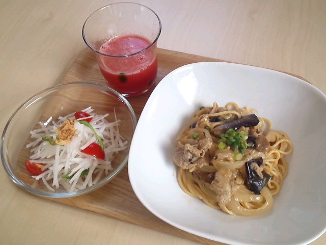 2011年08月30日 本日のメニュー・なすと味噌とチーズのパスタ 8月30日のメニューは、なすと味噌とチーズのパスタと、スイカのジュースと、野菜サラダです。 なすと味噌とチーズのパスタは味噌とチーズのソースをパスタに絡めていただきます。 揚げたなすや玉ねぎ、キノコと具材もたっぷり。 味噌にチーズを合わせるとコクがでて相性は抜群ですよ。 スイカのジュースは自然農法のスイカのジュースです。