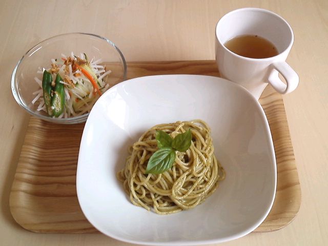 2011年10月11日 本日のメニュー・ジェノベーゼ 10月11日のメニューは、ジェノベーゼ(バジルのパスタ)と、オニオンスープと、野菜サラダです。 ジェノベーゼのソースは我が家のバジルを松の実とにんにく、オリーブオイルでミキサーし、ペーストにしました。 バジルの香りがとっても良くておいしいですよ。(^O^)