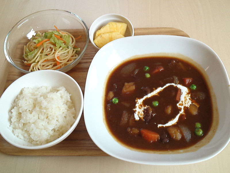 2011年10月07日 本日のメニュー・ビーフシチュー 10月7日のメニューは、ビーフシチューと、玉ねぎのパスタサラダと、パイナップルです。 サラダはレタス、にんじん、ツナ、オニオンスライスをポン酢で和えました。 ちょっぴりのごま油の風味がおいしいですよ。