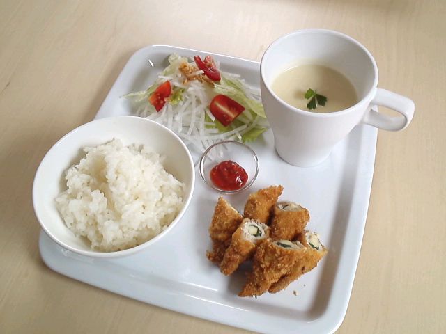 2011年12月01日 本日のメニュー・しそとチーズのくるくるカツ 12月1日のメニューは、しそとチーズのくるくるカツと、オニオンスープと、野菜サラダです。 今日は寒いですね。みなさん風邪には気を付けてくださいね。 すっかり葉っぱが落ちたNTT東日本伊豆病院さんの桜並木の向こうに、黄色く色づいた銀杏が見えます。 すごくきれいですよ。私も後で近くに行ってみようと思います。(^O^)