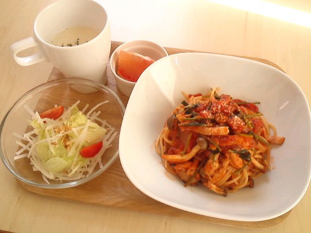 本日のメニュー・ほうれん草とベーコンのトマトソースパスタ