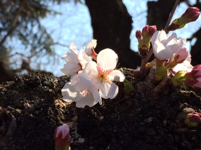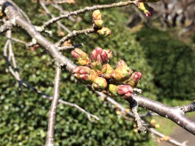 2014年03月19日 桜情報 発見しました! 上の写真は、幹から直接出てる蕾で、これは今年の一番咲きでしょうね。 ほかの枝は、下の写真ぐらいで黄緑色の蕾の先が割れてきて先がピンクになっているのもありました。 明日からの気温にもよりますがあと一週間ぐらいで開花でしょうか? 楽しみですねo(^▽^)o