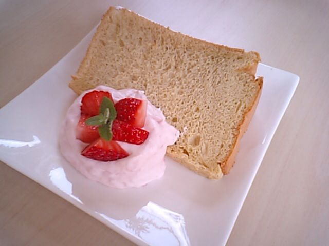 2014年03月19日 いちごクリームのシフォンケーキ 国内産小麦粉と、有精卵と、本和香糖を使って作ったプレーンのシフォンケーキに、丹那の生クリームと、紅ほっぺのいちごを混ぜた、いちごクリームを添えたシフォンケーキです。 甘酸っぱいいちごの香りが、たまらないシフォンケーキですよ^_^