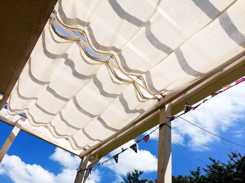 パーゴラにシェードをつけました。 写真はめっちゃよく撮れてしまいましたが(^_^;)素人の手作り感満載のシェードです。 レール用の棒を切って取り付けて、大きなシェード用の布を切って、縫って。 この黒糸のステッチは、旦那さんがちくちく縫いました。だってシェード用の針ってすごいぶっとくて、力いります。 漁師さんが網を直してる気分だー!と言ってました。そして、ハトメをつけて取り付けた棒にフックを通してハトメの穴に引っ掛けカーテンのように開け閉めできるようにしました。 ただ開け閉めは、手動。長い棒を使って右へ行ったり、左に行ったり。(^_^;) 紐をひっぱって開け閉めできるスグレモノもあるけど、まあ運動だと思って頑張ります。 シェードのおかげで昼間に影が出来て、お盆休み中はデッキで遅いブランチを楽しみました。 風がある日は気持ちいいですよ。
