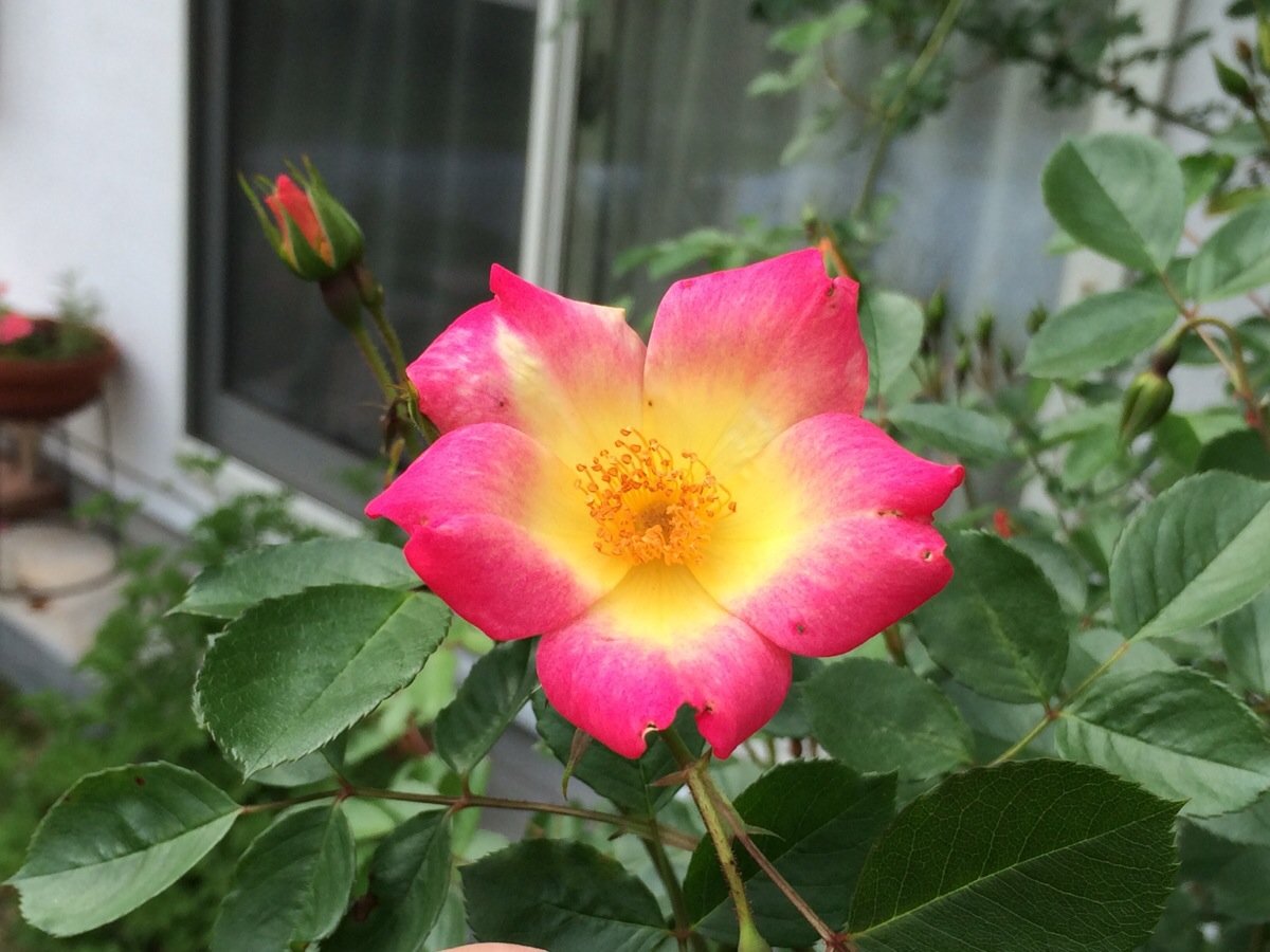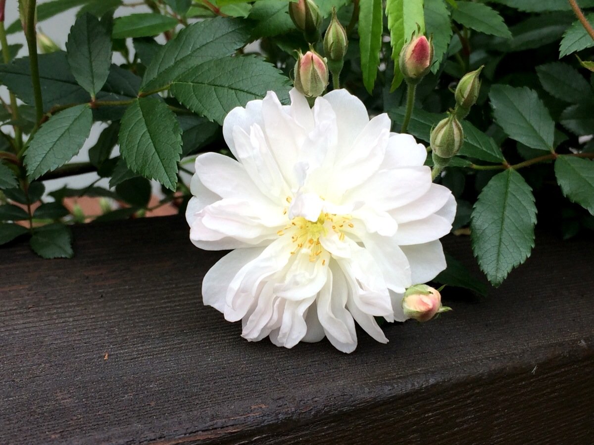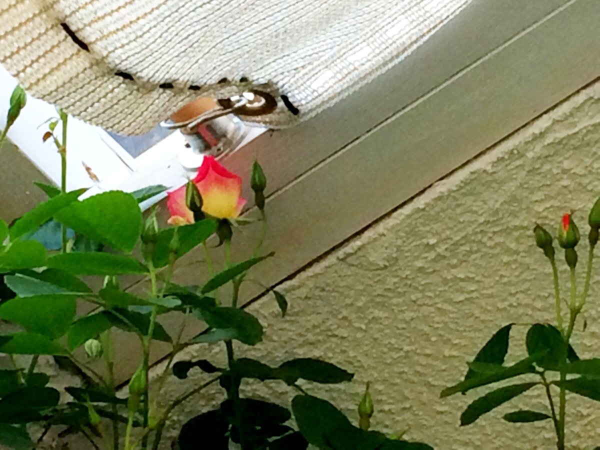 2015年04月27日 バラが咲き始めました 今日、つるバラのカクテルが一輪咲きました。 高いところなのでよく映りませんでしたが、今年の一番咲きです。 カクテルも、スノーグースも、羽衣も、つぼみがいっぱいです。 楽しみですね(^ν^)