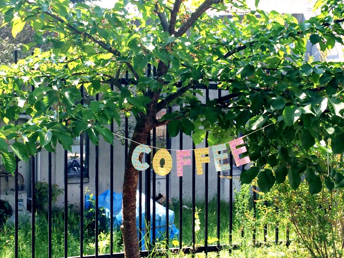 2015年04月28日 コーヒーやってます コーヒーの看板をフラッグガーランドにしました。 ビニールコーティングされた布を切り抜いてタコ糸につけてます。 ビニールコーティングされた布は、切るとくるくる巻いちゃうので、裏にはクリアファイルを切り抜いたものを貼っています。 これでピシッとアルファベットがみえます。 河津桜の新緑の中に、フラッグガーランドがゆらゆら揺れて、かわいい看板が出来ました(^ν^) 今日は久しぶりの営業日。お庭の緑とお花達がいっぱいですよ。
