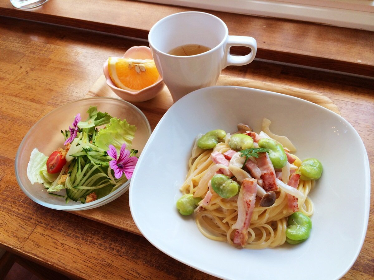 2015年05月27日 本日のメニュー・そら豆とベーコンのクリームパスタ 5月27日のおうちごはんは、そら豆とベーコンのクリームパスタと、野菜サラダとオニオンスープと、フルーツです。 本日の自然農法野菜は、山本さんちのそら豆と、山岡さんちのレタスです。