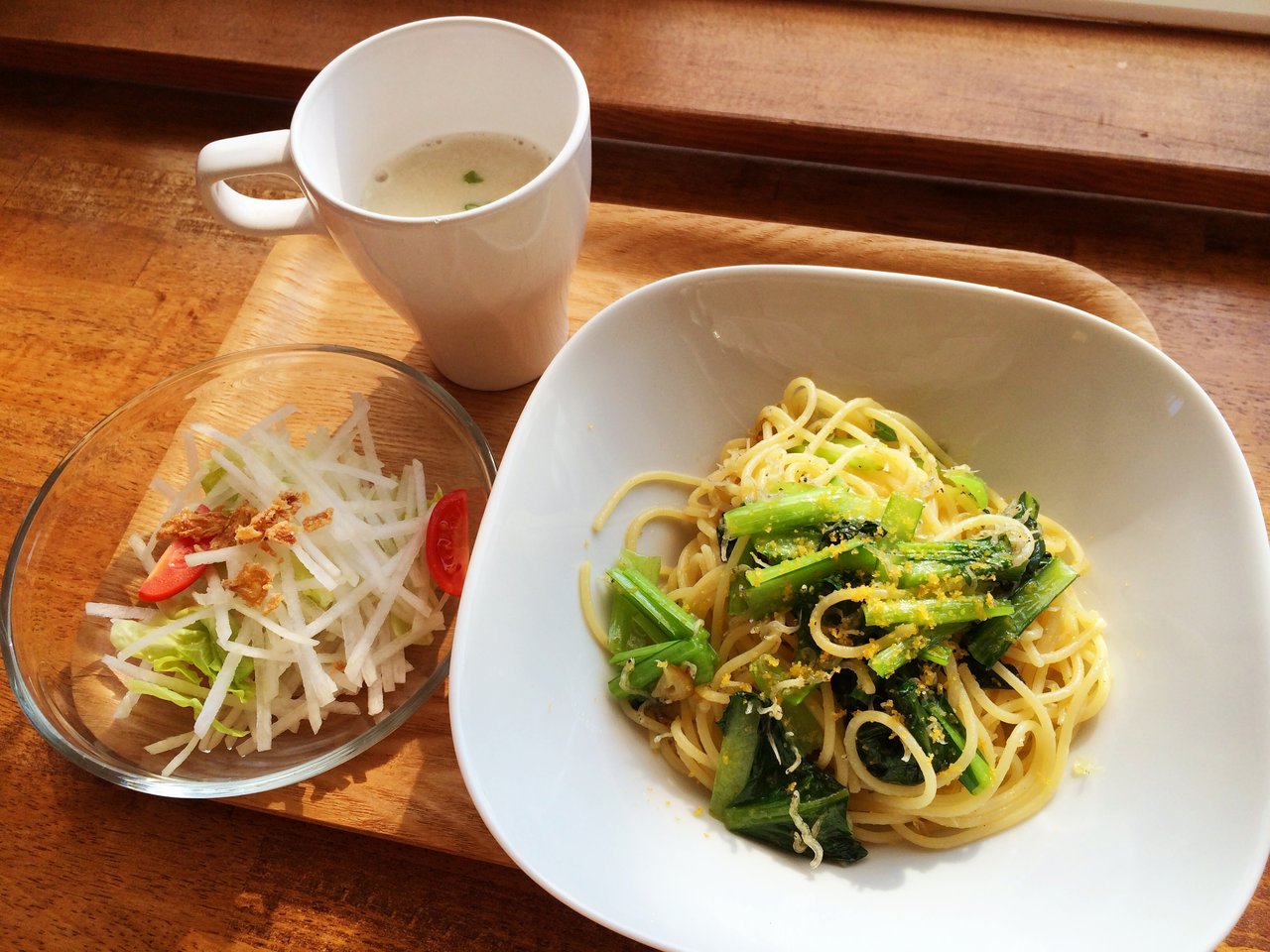 2016年01月07日 本日のメニュー・小松菜とからすみのパスタ&抹茶シフォンケーキ 1月7日のおうちごはんは、小松菜とからすみのパスタと、さつまいものスープと、野菜サラダと、りんごです。 シフォンケーキは、抹茶シフォンケーキです。 クリームは、あんこと丹那の生クリームを合わせたあんこクリームです。 和風な感じですが、コーヒーにすごく合いますよ。