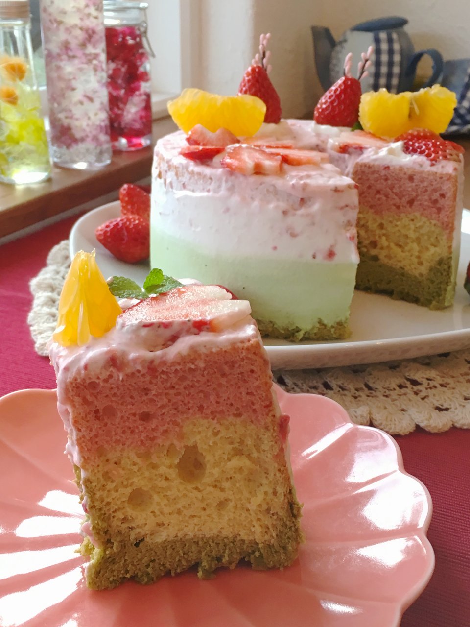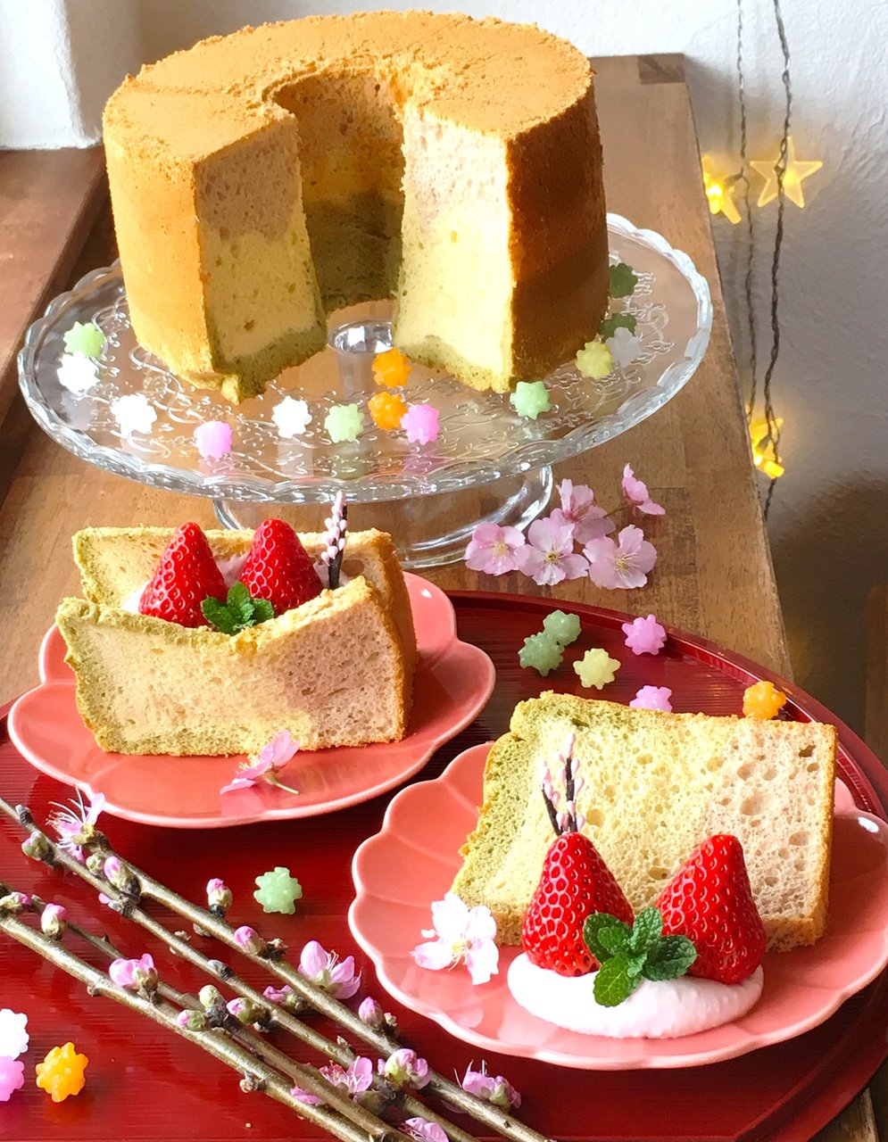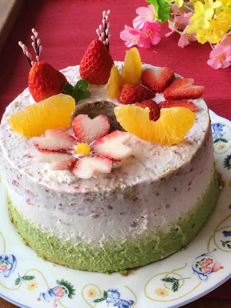 2018年02月27日 ひなまつりのシフォンケーキ ひなまつりのシフォンケーキ シフォンケーキは、下から、抹茶、プレーン、ブラックベリーとピンクの色素で色付けしております。 クリームは、丹那の生クリームで、抹茶クリーム、ホワイトクリーム、いちごクリームです。 お雛様とお内裏様に見立てた、松下農園さんの紅ほっぺいちごが2つ。 いちごで作った、いちご桜や、ネーブルオレンジもトッピングしてます。 17センチ2200円です。 20センチでもお受け出来ますよ。 お電話、コメントにて、オーダーお受けいたします。 よろしくお願いします。