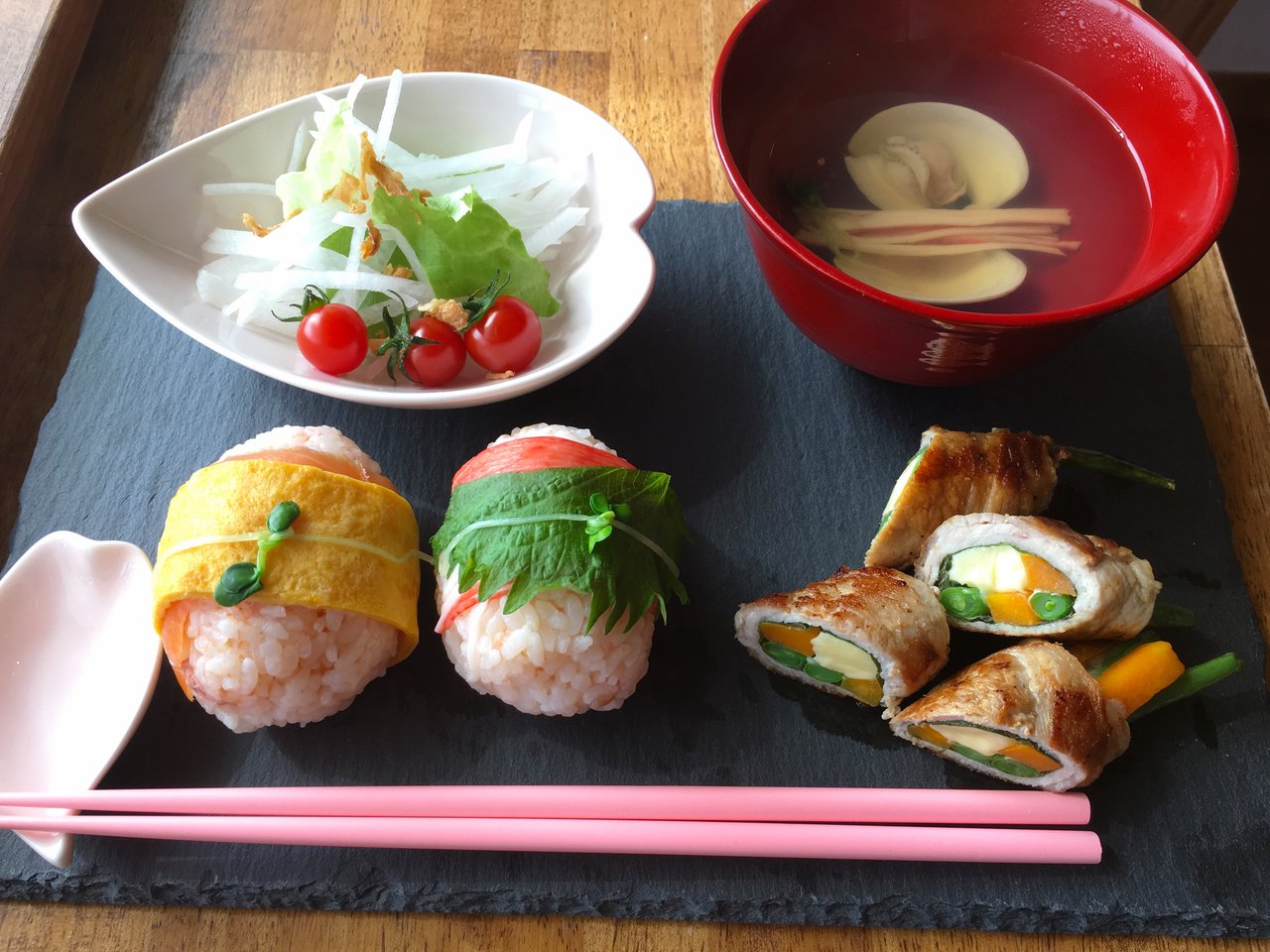 2018年02月28日 今日のメニュー・ひなまつり御膳&ひなまつりシフォン 2月28日のおうちごはんは、ひなまつり御膳で、お雛様とお内裏様のおにぎりと、いんげんとにんじんの肉巻、野菜サラダ、はまぐりのお吸い物です。 シフォンケーキは、ひなまつりのシフォンケーキです。