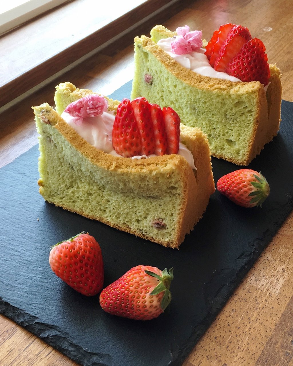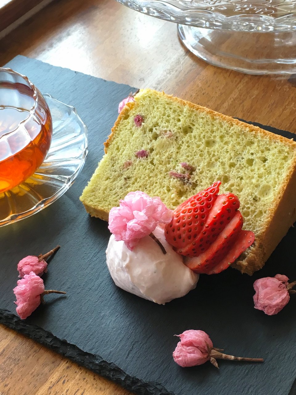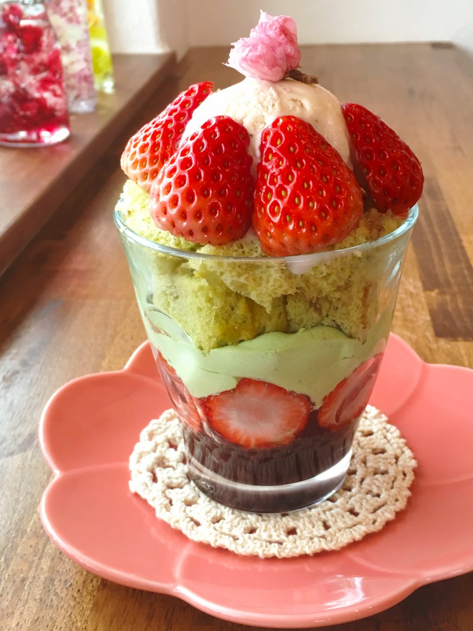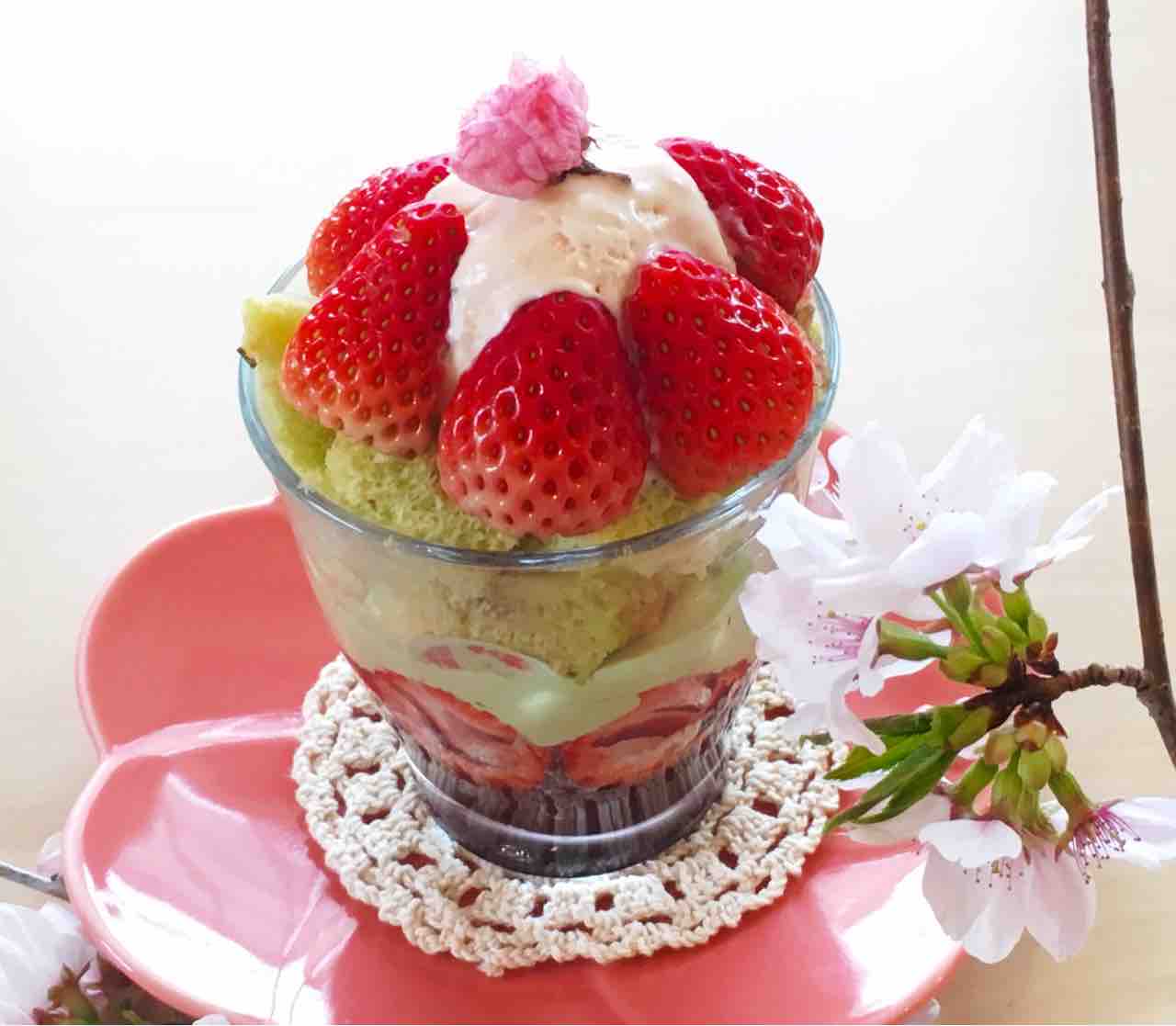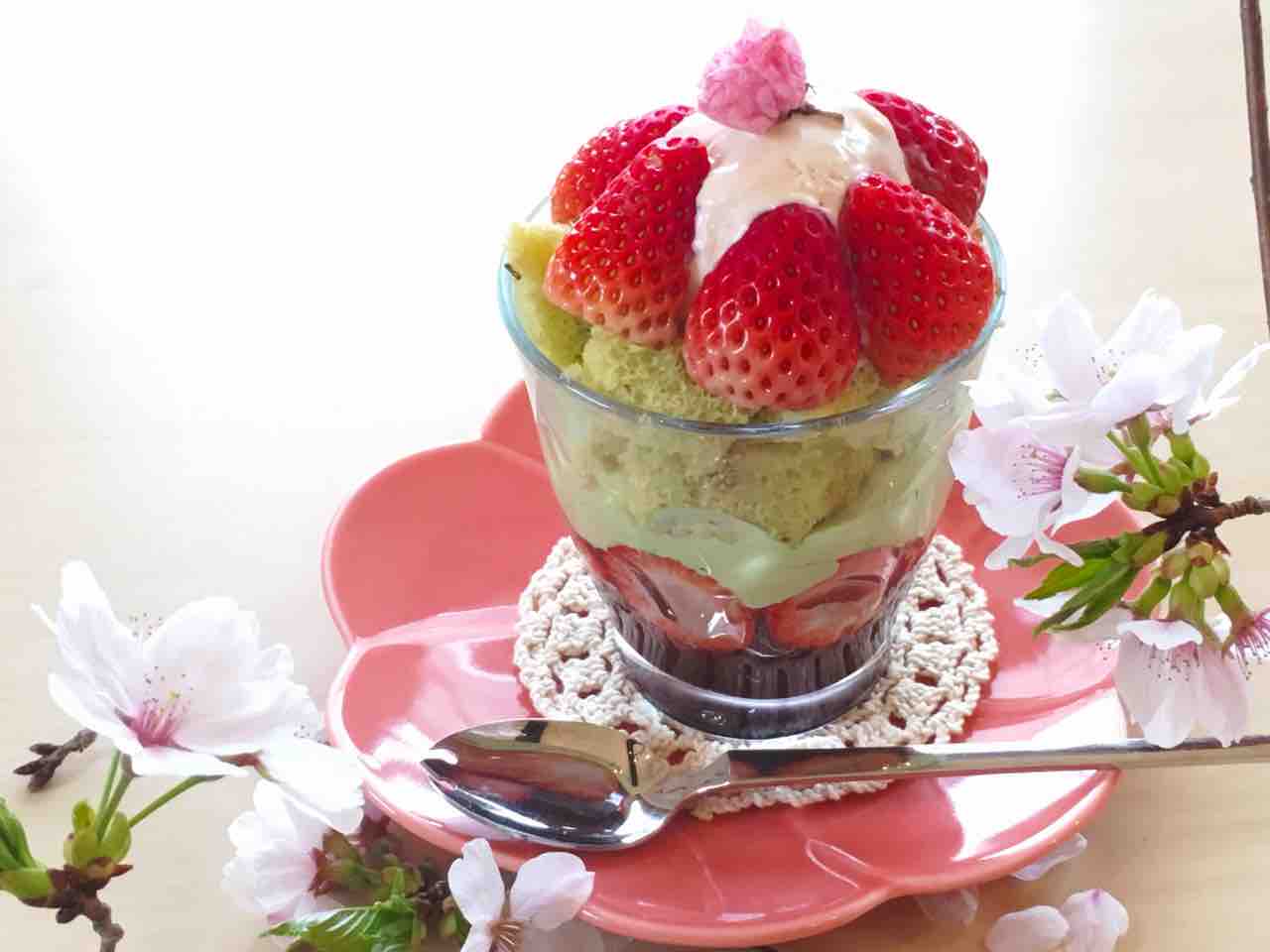 2018年03月23日 桜と苺のシフォンパフェ 桜と苺のシフォンパフェです。 下から、ぜんざい、白玉、丹那生クリームの抹茶クリーム、うぐいすきな粉のさくらシフォンケーキ、丹那生クリームで作った、桜アイスクリーム、松下農園さんの紅ほっぺいちごです。 このいちごは、クリームの甘さに負けない甘さ!本当に美味しいです! いちごの時期限定のパフェです。お待ちしていまーす(^^)